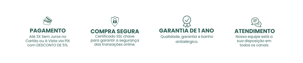 - Uso: Retire antes de atividades físicas, banho, natação ou aplicação de cosméticos. Evite contato com produtos químicos e seque bem após o uso.